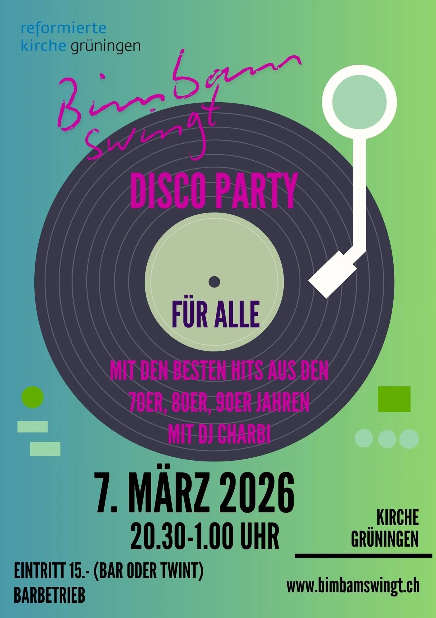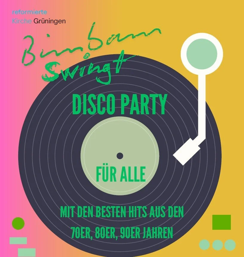 Disco mit 70er, 80er und 90er Musik in der Kirche Grüningen. Wieder einmal das Tanzbein schwingen und sich von vergangenen Hits in die jungen Jahre zurückversetzen lassen. All jene die lieber schwelgen als swingen, können sich einen feinen Drink an der Bar gönnen.